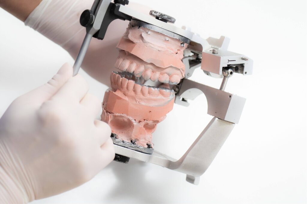 咬合器(こうごうき)という器械を活用、患者さまの頭の骨格に対する歯並びの傾きと理想的な顎関節(がくかんせつ)の位置で咬み合った瞬間を再現する模型を製作、お口の中を覗くだけではわからない現状や問題点を正確に把握します。