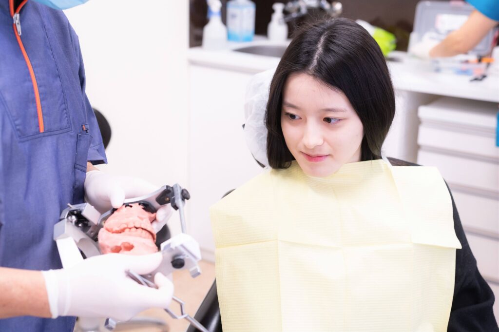 患者さまのかみ合わせを咬合器で再現、ご説明している様子